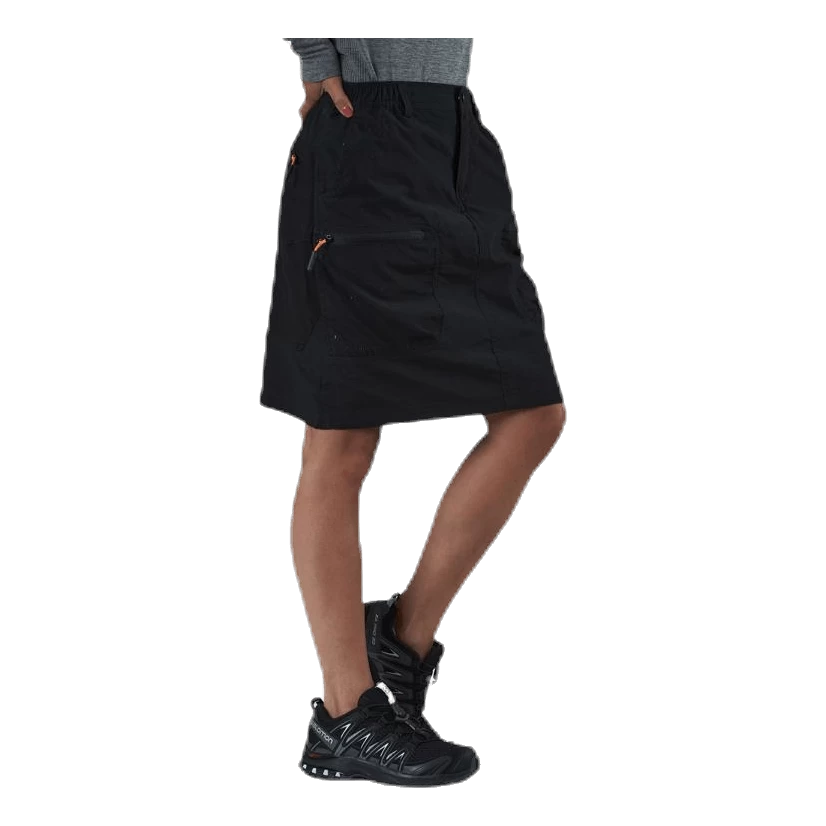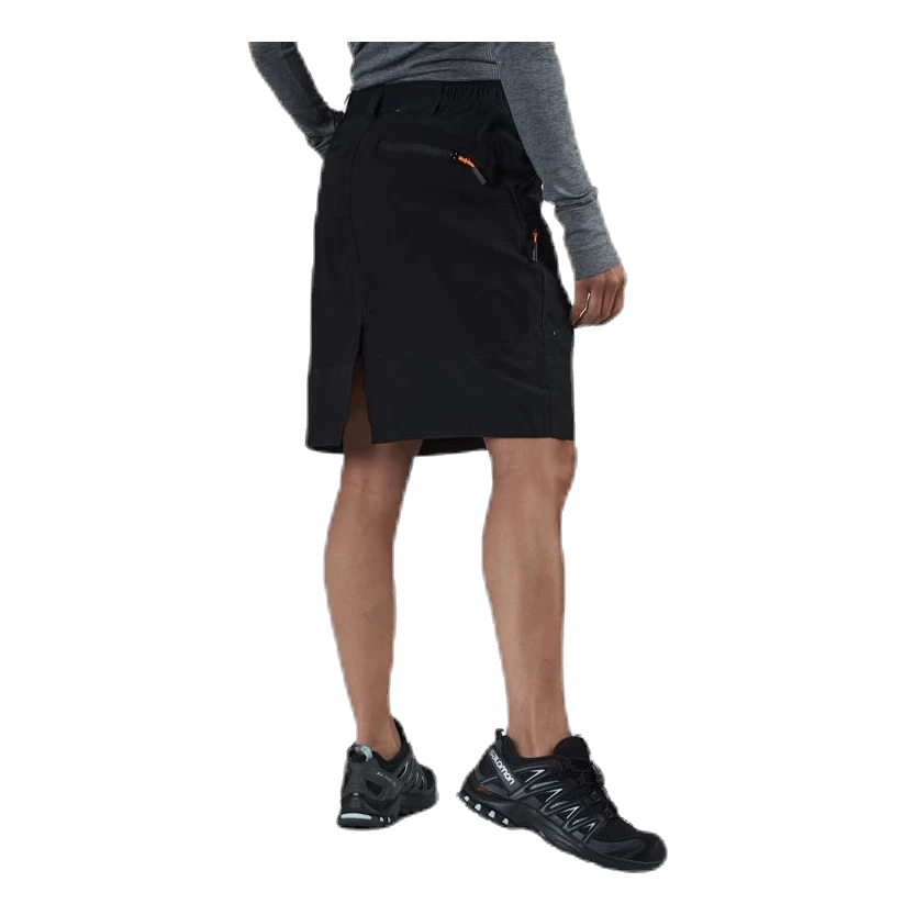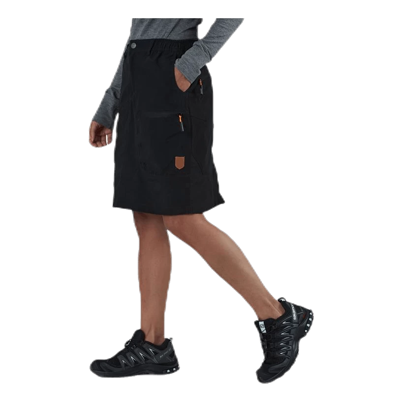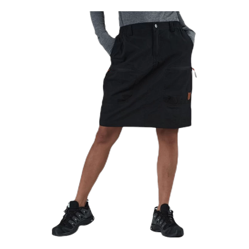 Een technische wandelrok gemaakt van ons prachtige comfortex materiaal. Om maximale mobiliteit te krijgen en schuren te voorkomen, heeft de rok een zachte polyester binnenbroek die ongeveer 10 cm voor de rokrand stopt. De rok is iets langer dan die van Hollie en valt tot op de knieën. Het heeft ook stretchpanelen aan de achterkant en elastische taille zodat je gemakkelijk kunt bukken en dus vrij kunt bewegen. Op de dijen zitten twee ritszakken waar je je waardevolle spullen op een makkelijk bereikbare manier in kunt opbergen. Op de achterkant heb je ook nog twee ritszakken.
