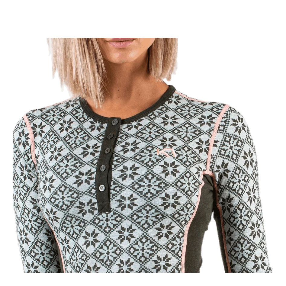 “Kari Traa Rose is hét ondergoed voor de Scandinavische winter dat zorgt voor maximale warmte en perfect is om laagjes over laagjes te dragen op koude dagen. Rose LS heeft een klassiek, vrouwelijk design en is gemaakt van 100% superfijne merinowol met four-way stretch. Aangename huid, ademt goed en is bestand tegen nare geurtjes. Dunnere zijpanelen onder de armen en een stijlvolle opening met knopen aan de voorkant zorgen ervoor dat het kledingstuk beter ademt. Een ondergoed waar je niet zonder kunt. Hoofdmateriaal: 100% wol, Gewicht : 240 g / m2, Vezel: 19,5 micron, Contraststof: 100% wol, Gewicht: 210 g / m2, Vezel: 19,5 micron Alleen trui, broek worden apart gekocht.