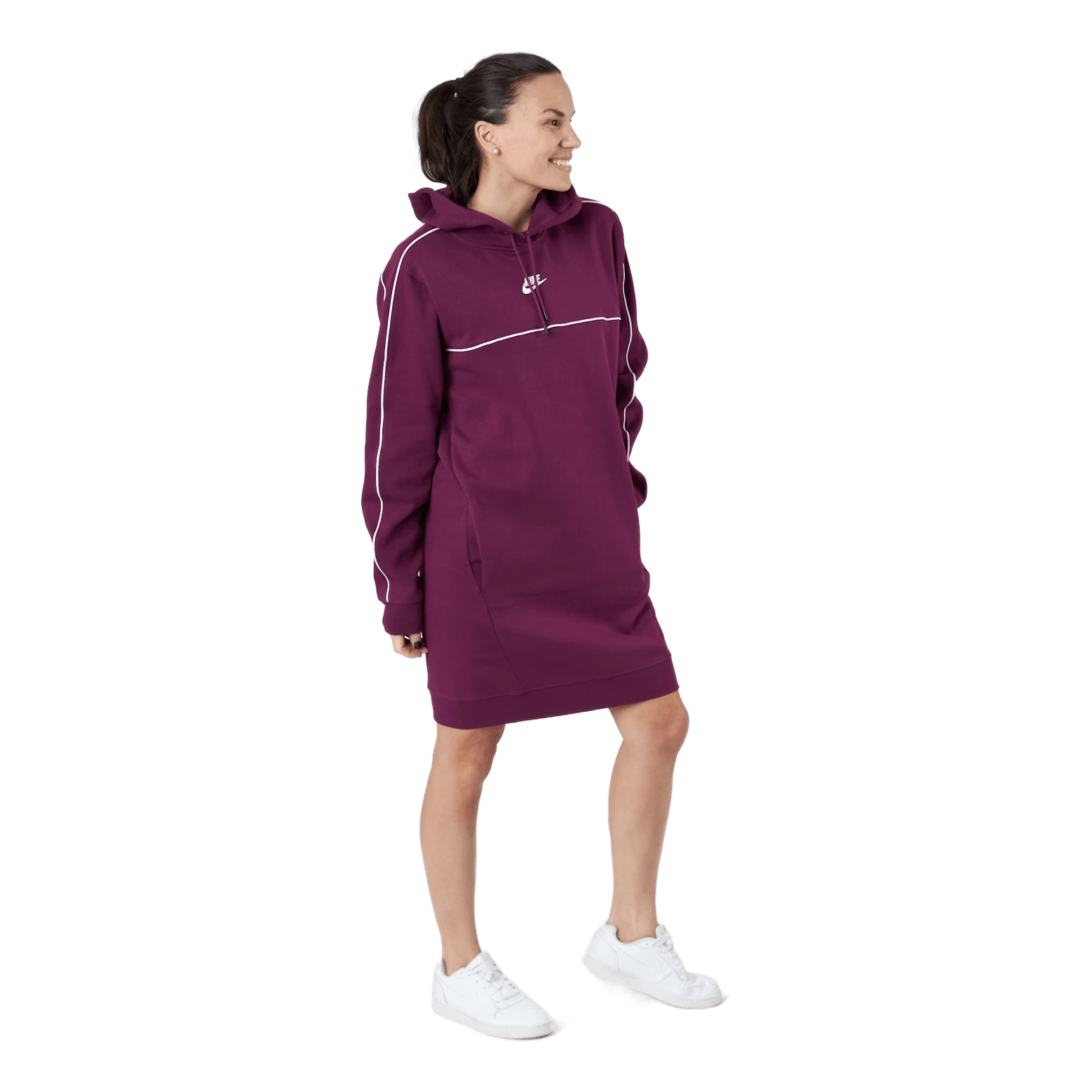 De Nike Sportswear-jurk is een gemakkelijk zittende stijl die is ontworpen om aan te voelen als je favoriete hoodie. De dubbelgebreide stof voelt glad, premium aan en wordt geaccentueerd met contrasterende biezen die zijn geïnspireerd op traditionele Nike trainingspakken. Handzakken bieden handige opbergruimte voor je telefoon, sleutels en kaarten.