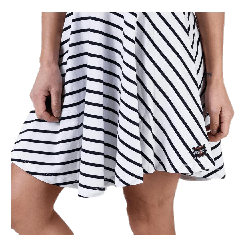Een hele mooie tricot jurk met een marine-geïnspireerde look. Het model heeft alleen schouders en een aansluitende pasvorm, een goede keuze voor mooie zomerdagen.