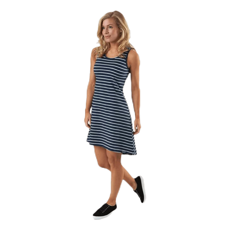 Een hele mooie tricot jurk met een marine-geïnspireerde look. Het model heeft alleen schouders en een aansluitende pasvorm, een goede keuze voor mooie zomerdagen.