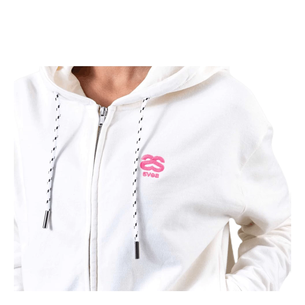 Hoodie met capuchon die sluit met een rits en een ruime buikzak heeft. Ribgebreide zoom en ribgebreide manchetten aan de manchetten. Heeft een svea band die loopt van de ene mouw, over de rug naar de andere mouw en een klein borduursel op de linkerborst.
